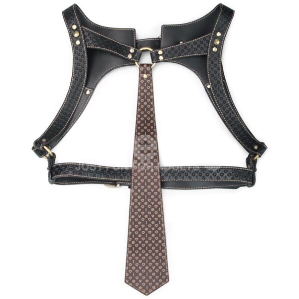At the chest, a 16-inch brown faux leather tie adds a playful touch to the bold ensemble. The pelvic front features a detachable elastic silicone O-ring, making it perfectly compatible with strap-on dildos. This harness offers versatility for both daily wear and more intimate bondage play, it?s not just an accessory but an expression of rebellion and opulence.